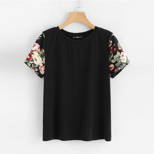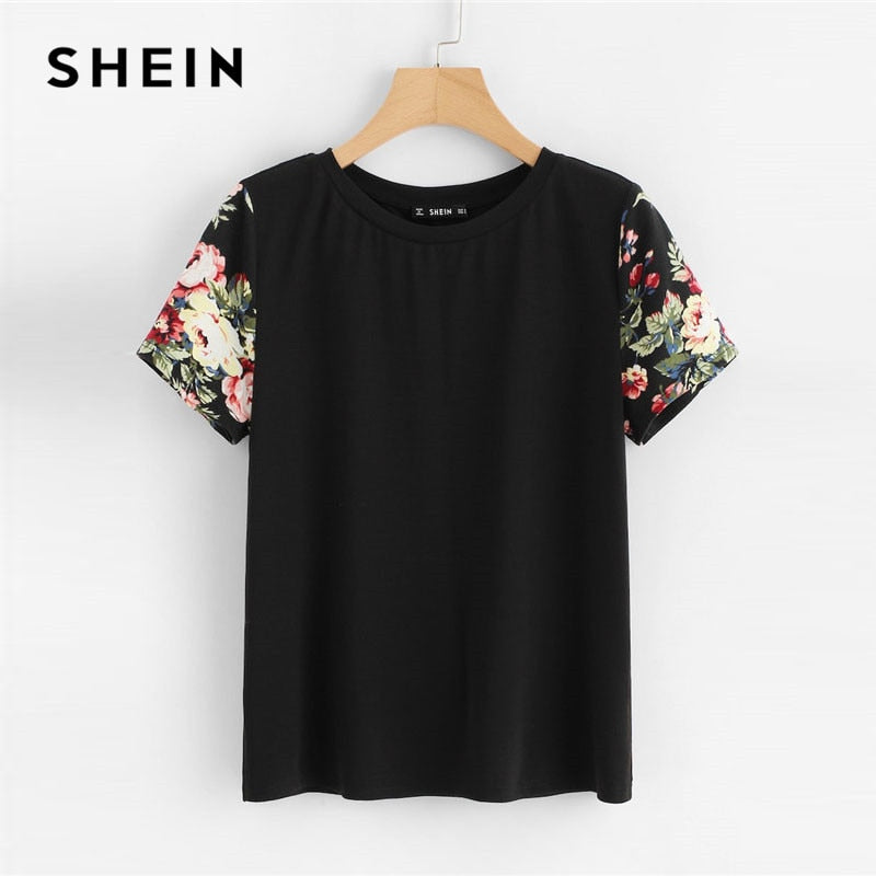 SHEIN Black Floral Print Sleeve Women Casual Tee O-neck Short Sleeve Tops Summer 2019 Weekend Casual T Shirts Female Clothes